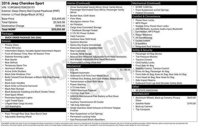 Boasting an impressive 20 city/28 highway MPG, the 2016 Jeep Cherokee Sport delivers exceptional fuel efficiency without compromising its off-road capabilities. Whether you're navigating the daily commute or embarking on a weekend adventure, this Jeep will ensure a smooth and confident ride.